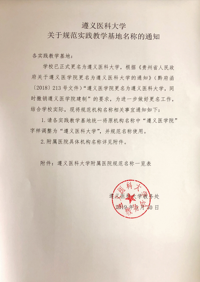 當(dāng)前位置:首頁(yè)>科學(xué)教研>實(shí)習(xí)生管理【通知】遵義醫(yī)科大學(xué)關(guān)于規(guī)范實(shí)踐教學(xué)基地名稱(chēng)的通知