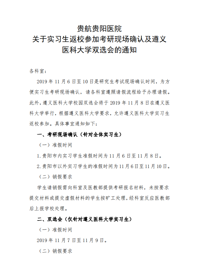 當(dāng)前位置:首頁>科學(xué)教研>實(shí)習(xí)生管理【通知】關(guān)于實(shí)習(xí)生返校參加考研現(xiàn)場確認(rèn)及遵義醫(yī)科大學(xué)雙選會(huì)的通知