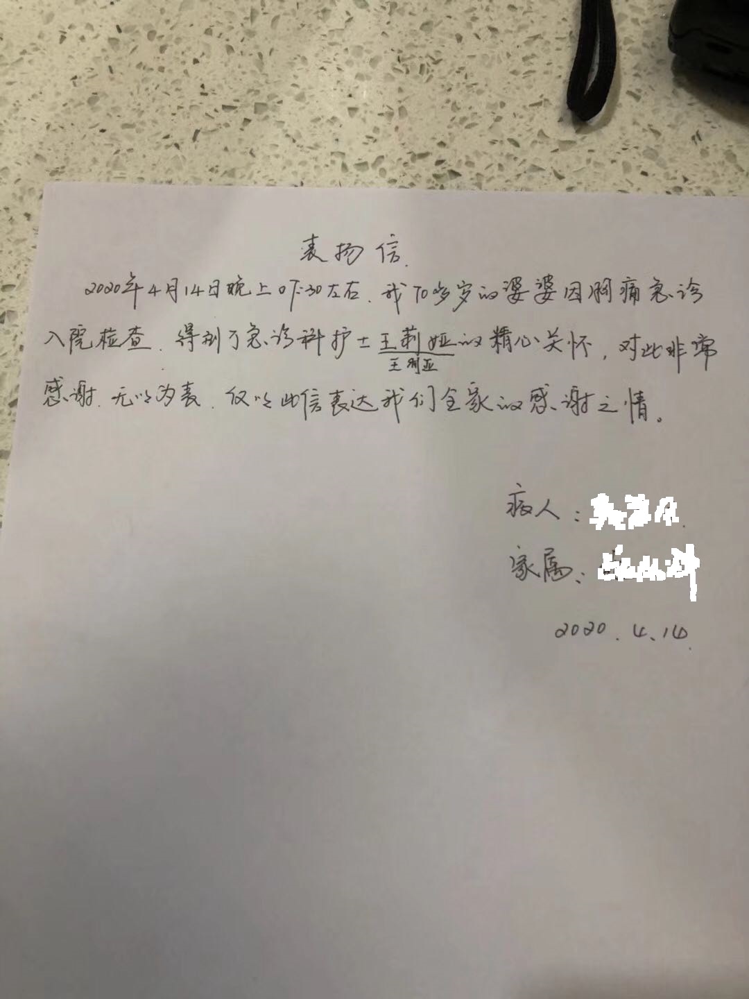 當(dāng)前位置:首頁>護(hù)理風(fēng)采>天使風(fēng)采4月14日,急診科收到了一封患者給護(hù)士王利亞的表揚(yáng)信。