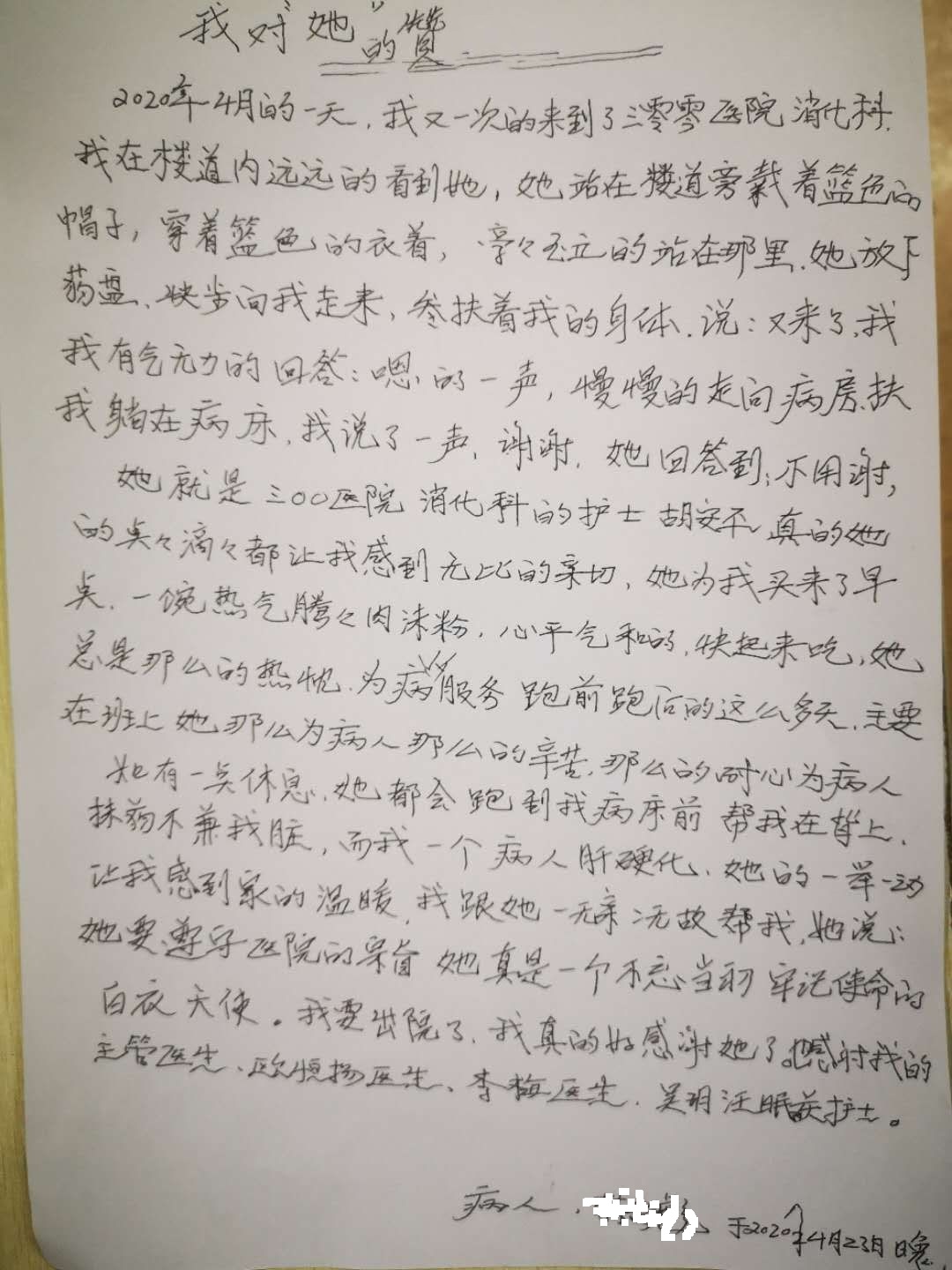4月26日消化內(nèi)科第二次收到一位老患者第二次送來的感謝信,他的言語間表達了對科室的醫(yī)療服務的肯定與感謝,以對“她”的贊為題表達了對護理人員的贊許。